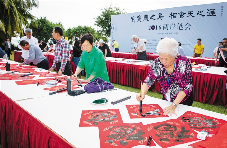 12月14日,2016两岸笔会以艺术展作为闭幕仪式的压轴大戏,300余幅书法、绘画及摄影作品集体亮相,展示了琼岛自然和人文之美。“两岸笔会就是三亚最大的福地。”蒋子龙不禁感慨道。