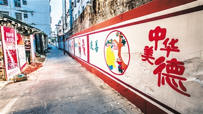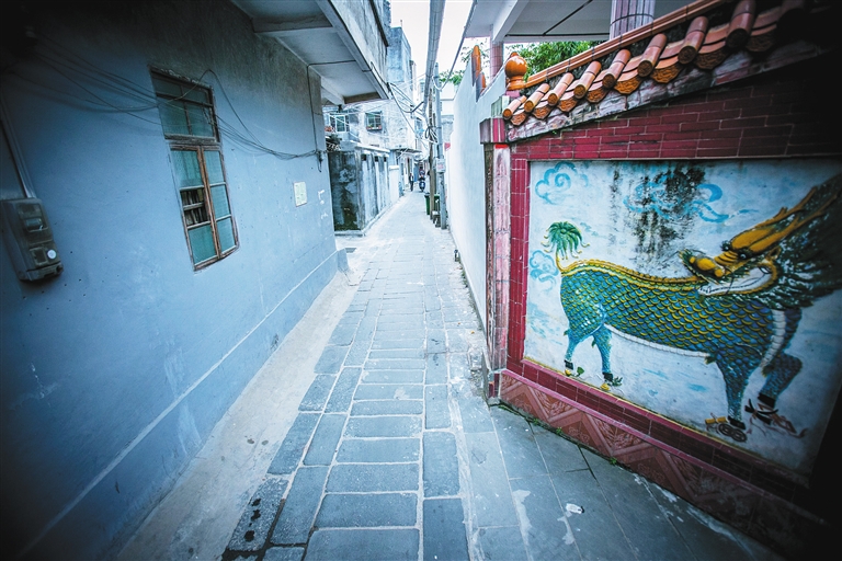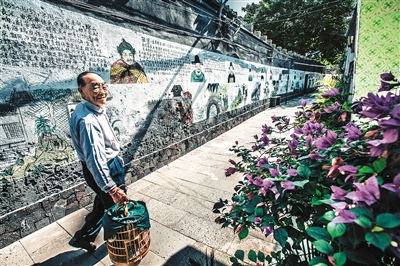 住在仁和坊30号的九旬老人王庭槐刚刚买菜回来,一手拎着菜,一手提着鸟笼,沿着仁和巷弯弯曲曲的石板路往回走,他身后长长的沿街墙面上,画的是数十位琼山古代先贤,为首的正是被称为“一里三贤”的邱濬、海瑞和许子伟,老人在画中走,历史也随着他脚步一页页翻过。