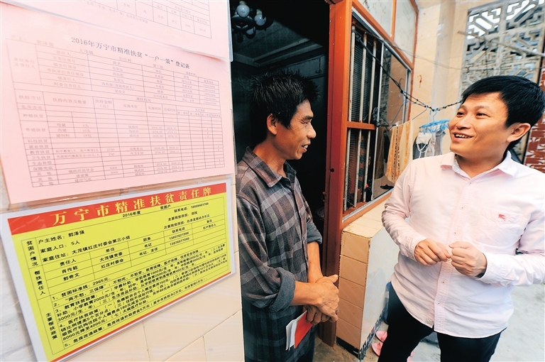 近日,在万宁市大茂镇红庄村,被列入大茂镇精准扶贫户退出名单的贫困户郭泽强(图左)喜笑颜开,镇干部贺建强正和他谈心,一起商量巩固提升办法。据悉,该村有20户贫困户即将在年底摘掉“贫帽”。本报记者 袁琛 摄