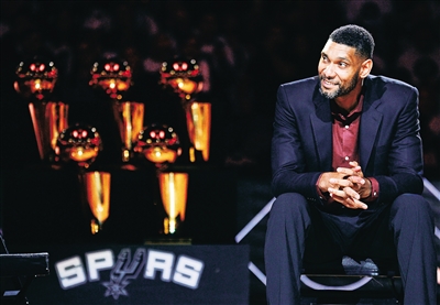 北京时间12月19日,马刺队为功勋球员邓肯举行21号球衣退役仪式。图为邓肯在球衣退役仪式上,旁边为他获得的5座总冠军奖杯。 新华社发