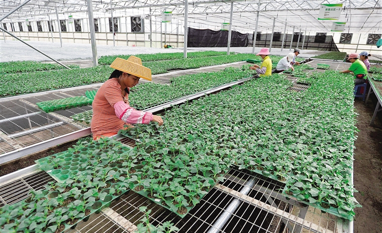 12月19日,位于海口市龙泉镇的海南新发地现代农业发展有限公司育苗基地,工人们正在育苗盘。公司在针对周边乡村贫困户实行带动生产、转移就业、入股分红三种扶贫措施的基础上,还开展了“X”项组合,如“农家乐+贫困户”、“基地+合作社+信贷扶贫”等多项扶贫模式。公司就业的贫困户在学习技能的同时,每天有100元的工资收入。以2万元扶贫款参股的贫困户,每年现金分红最少8000元。据悉,目前已有40多家贫困户签订了入股协议。本报记者 王凯 特约记者 刘伟 摄