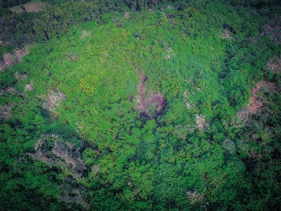 通往“大石坑”的路无比艰难。车辆在水泥路上行驶了约一公里后,在一处密林缺口处停下。“往林子里走就是尚天山了。”下车后,带路的村民蒋成友叫来几名村民,艰难地用劈山刀在布满荆棘、藤条的密林中开出一条道。