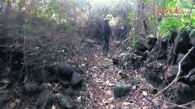 这是12月17日,本报记者与地质专家在位于海口市琼山区龙塘镇新民村儒贡村小组附近的尚天山中,穿越茂密的植被、嶙峋的怪石,对村民口中的“大石坑”进行的一次实地勘察。