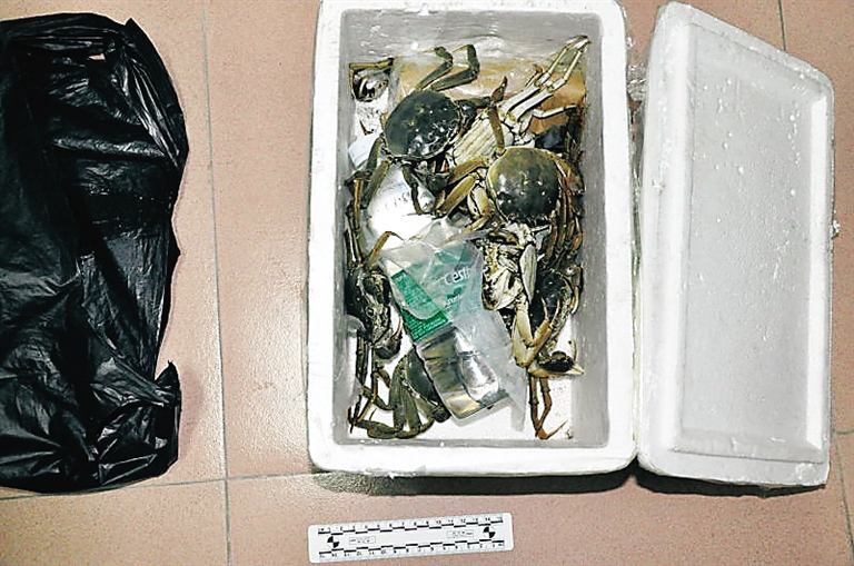 “这让我们顿时警觉起来。”办案民警符警官介绍,民警立即对泡沫箱进行仔细检查,发现箱子内除了装有螃蟹和冰袋外,底部还有一个用褐色硬纸皮包裹的一袋透明晶体可疑物(左图,警方提供)。