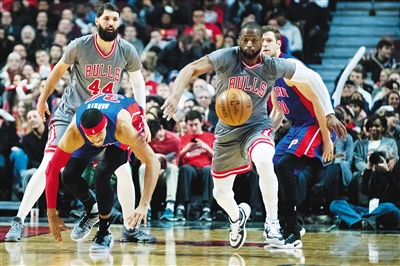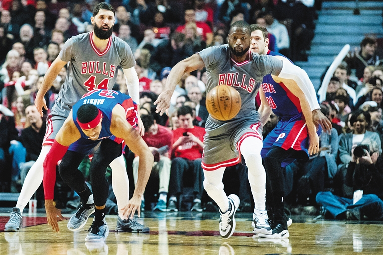 公牛队球员韦德(右)与活塞队球员哈里斯拼抢。新华社发