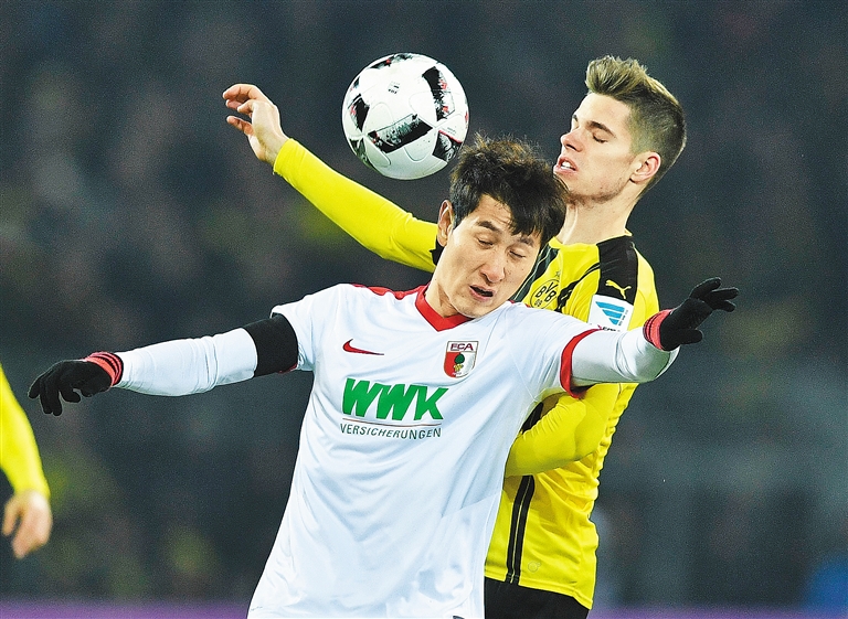 北京时间12月21日,在德甲第16轮比赛中,多特蒙德主场与奥格斯堡战成1:1,遭遇联赛三连平。图为多特蒙德队球员魏格尔(右)与对手争顶。新华社发