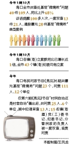 今年1月到10月,海口全市共查处基层“微腐败”问题40件109人,同比上升68%;谈话提醒100多人次,一案双查13件21人,通报曝光28件基层“微腐败”典型案例。仅今年第六期《亮见》节目“村民自治还是村官自治”播出后,四个区就立即召开会议落实整改和问责工作,共问责25人、6个单位,其中纪律审查13人;15名镇(街道)党(工)委书记、纪委书记、分管民政的负责人被一案双查,追责问责。