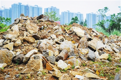 海口市迎宾大道某楼盘附近,草丛里乱堆乱放的建筑垃圾与周边建筑形成了一幅极不和谐的画面。本报记者 袁琛 摄