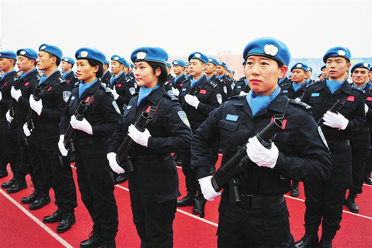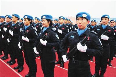 12月22日,公安部常备维和警队队员在成立仪式上。 当日,公安部常备维和警队在山东省东营市挂牌成立。公安部常备维和警队由公安部边防管理局负责组建,山东公安边防总队日常代管,为副师职建制,编配队员300余人,所属队员均从全国公安边防部队严格选拔,下设防暴一队、二队。 新华社记者 邵琨 摄