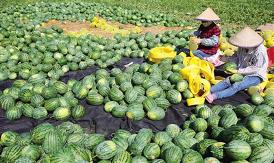 据介绍,东方今年种植秋季西瓜1.8万亩,品种有小惠兰、无籽瓜、黑美人、墨瞳等品种。秋季西瓜从11月份上市以来,上海、天津、黑龙江等地的订单便接踵而至,市场收购价每市斤在2.2元至2.6元之间,平均价格高于去年。本报记者 苏晓杰 特约记者 高智 摄
