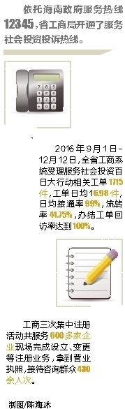 为全力服务社会投资百日大行动,依托海南政府服务热线12345,省工商局开通了服务社会投资投诉热线。2016年9月1日-12月12日,全省工商系统受理服务社会投资百日大行动相关工单1715件,工单日均16.98件,日均接通率99%,流转率44.75%,办结工单回访率达到100%。海南工商主动服务的做法得到企业的高度赞赏,为助力社会投资项目落地、推动海南经济社会发展做出了积极贡献。
