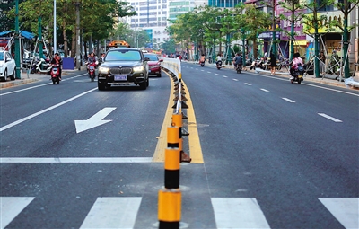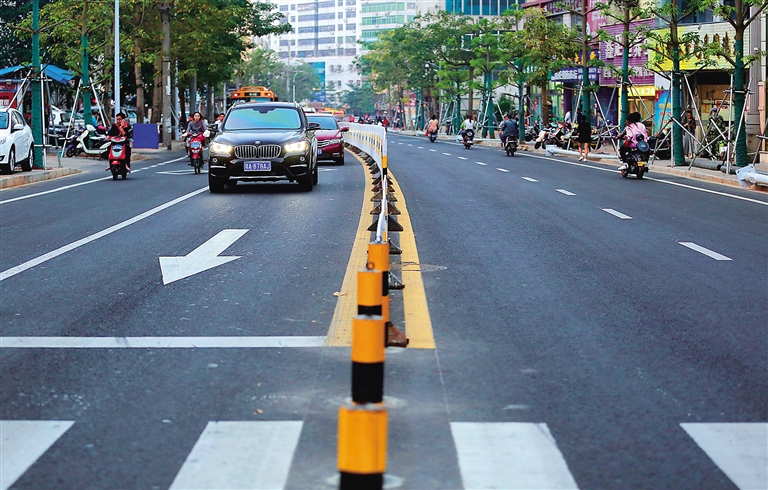 12月22日,过往车辆在改造一新的海口市五指山路行驶。据了解,因海口城市中心区部分道路年代久远,已超过设计使用年限,今年海口启动了包括五指山路在内的42条城市道路的提升改造工作。