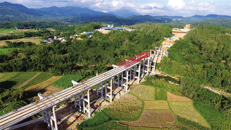 12月21日,在琼乐高速琼中黎族苗族自治县红毛镇段的罗天大桥,施工人员正在铺设桥面,预计春节前可以铺设完成。琼中至乐东高速公路建设正加快施工,截至今年11月底,琼乐高速已累计完成投资约53.1亿元,占总投资额的45.7%。据了解,琼乐高速公路项目全长129公里,总投资117亿元,预计2018年建成通车。