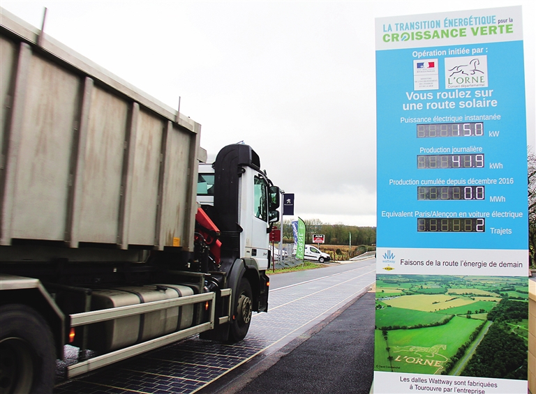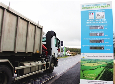 全球首段“太阳能公路”22日在法国西北部图鲁夫尔欧佩尔什镇正式投入使用(见上图)。这是目前世界上第一段真正可供机动车行驶的“太阳能公路”,能将太阳能转化为电能,为城市供电。 新华社记者 张雪飞 摄