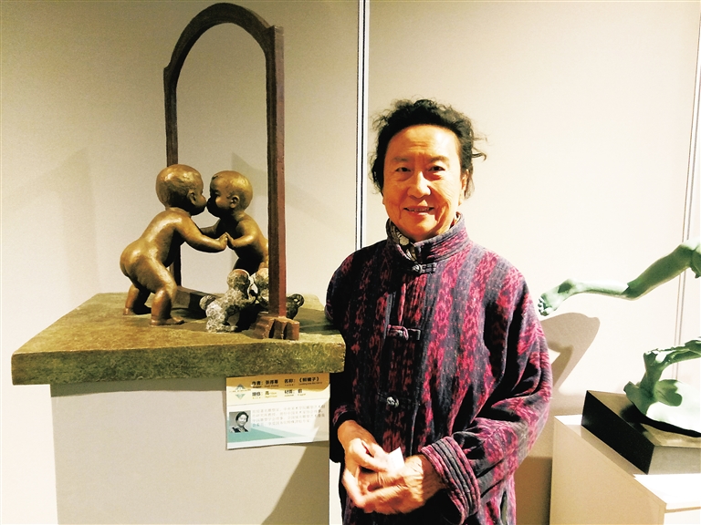 “这是幅小品,灵感来源于我小孙女小时候照镜子的趣事。”在参展作品《照镜子》前面,张得蒂与大家分享作品背后的创作故事。原来,小朋友照镜子的时候发现镜子里还有一位小朋友,她便开心地亲吻另外一个小朋友,张得蒂觉得这件事很有趣,便用雕塑镌刻下来。