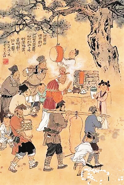 尽管是放假了,和现在一样,各府、衙门都得安排官员值班。皇上还要举行一些活动,大臣都得跟着。元旦这天,皇帝要举行隆重的朝贺大典,献岁启新,还要祭祖拜神,皇帝率领一班王公大臣,诣皇太后宫行庆贺礼,以表达孝顺之心及祝福。而臣子也要按照层级规则,向皇帝觐表,恭贺元旦。唐德宗李适在《元日退朝观军仗归营》一诗中,记载了元旦那天的忙碌。元旦之日,等百官拜过之后,他又阅了兵,一整天没有休息,忙得不可开交。《水浒传》一百一十回里也写了宋江招安后,于元旦这天到朝廷朝贺之事:“时下又值正旦节相近,诸官准备朝贺。蔡太师恐宋江人等都来朝贺,天子见之,必当重用,随即奏闻天子,降下圣旨,使人当住,只教宋江、卢俊义两个有职人员,随班朝贺”。“是日正旦,百官朝贺。宋江、卢俊义俱各公服,都在待漏院伺候早朝,随班行礼。是日驾坐紫宸殿受朝,宋江、卢俊义随班拜罢,于两班侍下,不能上殿。仰观殿上,玉簪珠履,紫绶金章,往来称觞献寿,自天明直至午牌,方始得沾谢恩御酒。百官朝散,天子驾起。宋江、卢俊义出内,卸了公服幞头,上马回营,面有愁颜赧色。”
