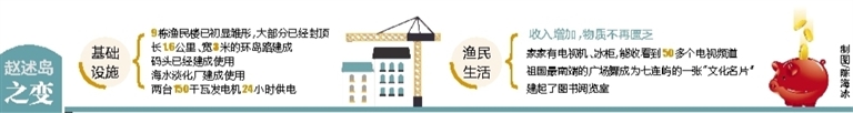 如今,赵述岛不仅有海水淡化厂,两台24小时供电的150千瓦发电机,渔民家家有电视机、冰柜,还有太阳能、村村通、户户通,渔民能收看到50多个电视频道。