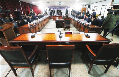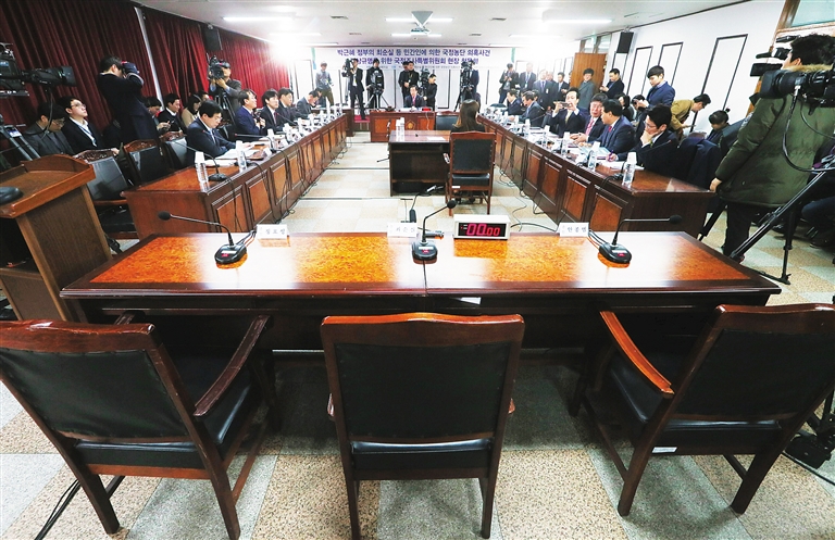 12月26日,在韩国首尔市郊一处看守所举行的特别听证会上,韩国总统朴槿惠“亲信干政”事件关键人物崔顺实的座位(中)空着。 崔顺实26日面对国会国政调查特别委员会委员审问时否认与总统“共谋”,表示不认识青瓦台前秘书室室长金淇春和青瓦台前民政首席秘书禹柄宇,并表示“做好了服无期徒刑的准备”。 新华社/法新