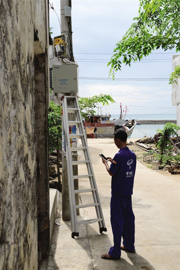 杨北的屋外,中国电信的装维员林志平一边在光纤杆线下巡查,一边熟络地与渔船上的居民打招呼。“李伯——”他放开嗓子对着一条小船喊道:“你的手机还好用吗?”“好用好用,出去几十海里还有信号。”渔船里冒出来一顶斗笠,斗笠下一张晒得黝黑的脸,笑眯眯地回答他。