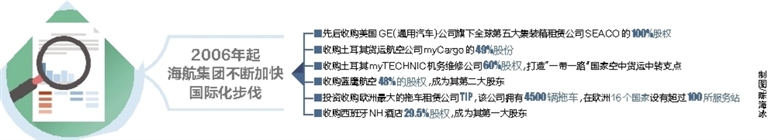 海航还敏锐地抓住全球资源重新配置的千载难逢机遇,充分研判,加大海外资产配置,积累境外航线网络、优质物业、金融资产等战略资源,通过并购重组香港航空、蓝鹰航空、加纳航空,完善了全球航空网络;通过收购ALLCO和GE SEACO,海航构建了全球租赁产业链,极大地提升了自身租赁产业的核心竞争力;对西班牙NH酒店的并购,使海航实现了酒店业务的全球布局。