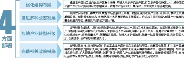 《意见》指出,进一步促进农产品加工业发展对促进农业提质增效、农民就业增收和农村一二三产业融合发展,对提高人民群众生活质量和健康水平有着十分重要的作用。