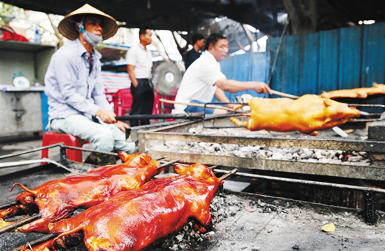 “我们店在这儿开了22年了,是个老字号。”亚香美食店经营者钟进香是个做烤乳猪的高手,正在火炉旁烤乳猪的老师傅是她的徒弟。据钟进香介绍,做东方烤乳猪要挑选四斤左右的体小腰直、皮薄肉厚的乳猪。