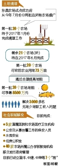 今年5月份,海南农垦改革办印发《2016年海南农垦改革事项工作计划表》,要求今年继续加快垦区集团化、农场企业化改革,在今年12月底前要完成垦地社会职能机构移交工作。