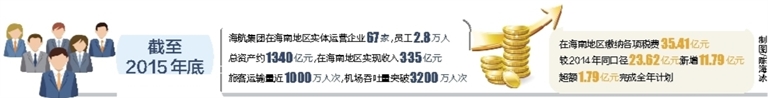 据介绍,2015年海航集团累计在海南地区完成投资额411.58亿元,较2014年增加278.99亿元,超额178.99亿元完成全年计划;启动美兰机场二期扩建,获国家及民航专项资金补贴12.84亿元;完成凤凰机场T2航站楼建设并投入使用;海南第一高楼海航国际广场正式建成亮相;与中国供销集团合作成立海南供销大集控股有限公司,注册资本269亿元,是海南省注册资本规模最大的企业。