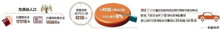 推进户籍制度改革。为方便来琼务工人员办理居住证及落户、解决黑户落户问题,海南公安机关积极推动《海南省人民政府推进户籍制度改革的实施意见实施细则》的出台,全面落实省政府户改新政,实现居住证制度全面覆盖,共为流动人口办理居住证171718张。推进解决无户口人员登记工作:印发《海南省无户口人员登记户口实施办法》,全面解决无户口人员登记入户问题,各地共排查各类无户口人员4236人,解决4130人的户口问题,占总人数的97%;全面实施面向全国(双语证地区除外)的居民异地身份证受理工作,共办理异地身份证14564张。