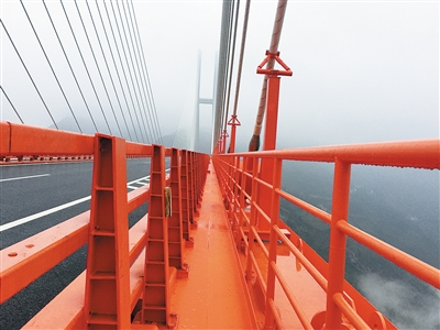 12月29日拍摄的北盘江大桥人行通道。 12月29日,横跨贵州省六盘水市都格镇和云南省宣威市普立乡的北盘江大桥正式建成通车。北盘江大桥公路设计等级为双向四车道高速公路,全长1341.4米,桥面到谷底垂直高度565米(相当于约200层楼高);大桥主桥为钢桁梁斜拉桥,主跨720米,垂直高度和桥梁跨度均属世界罕见。 新华社记者 浦超 摄