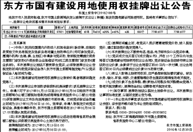 东方市国有建设用地使用权挂牌出让公告