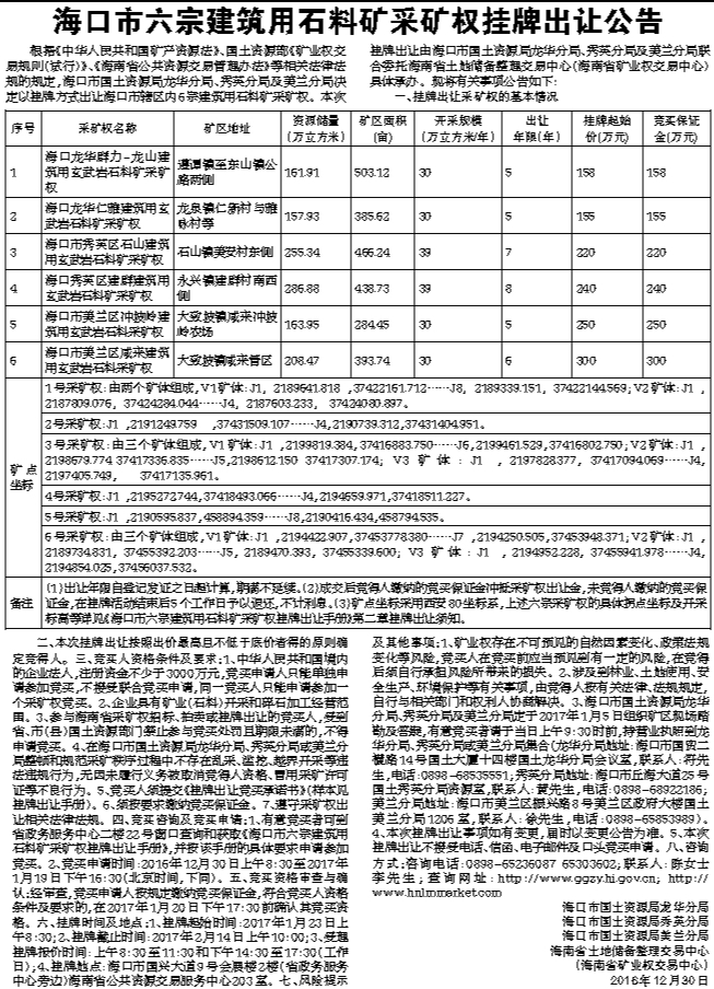 海口市六宗建筑用石料矿采矿权挂牌出让公告