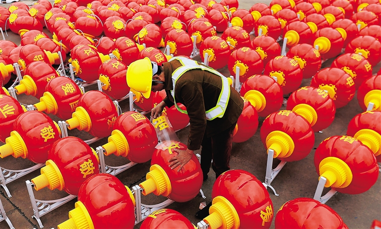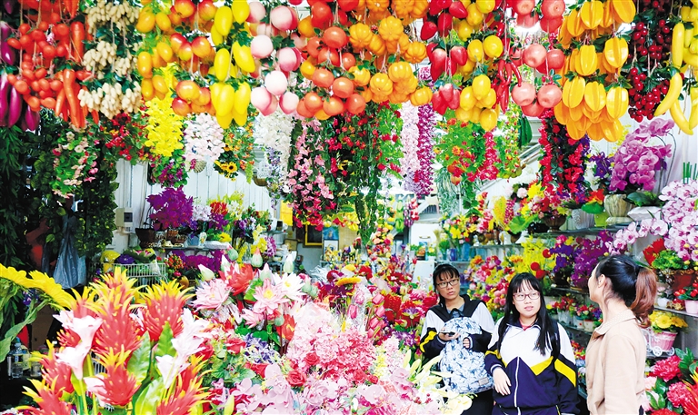 12月28日,工人们正在街头准备悬挂灯笼的情景。据了解,连日来,为了营造元旦春节喜庆氛围,给市民游客创造快乐祥和的节日环境,海口市市政管理局组织维修公司的工人,加班加点在国兴大道、滨海西路、永万路等13条道路挂灯笼(右图,本报记者 张杰 通讯员 郭辉 摄)。在海口博爱路骑楼老街,提前迎来了鲜花饰品采购高峰(左图,本报记者 陈元才 摄)。