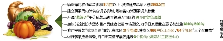 为提高蔬菜供应量,在本地的生产环节,海口发动基地、合作社进行常年蔬菜生产,确保每月种植蔬菜面积3万亩以上;目前已安排全市种植甜菜150亩、水芹80亩;提高大棚种菜率,今年扶持建成蔬菜大棚2082.5亩。