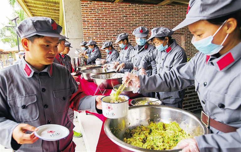 临近饭点,“公社食堂”里排起了长队,许多游客领到“定制版”的饭盒和粮票后,第一件事便是拍照分享给朋友。