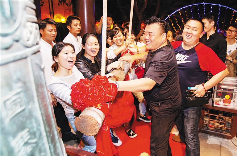 2017年1月1日,游客们在三亚南山景区撞钟祈福,希望在新年讨得一个好彩头。