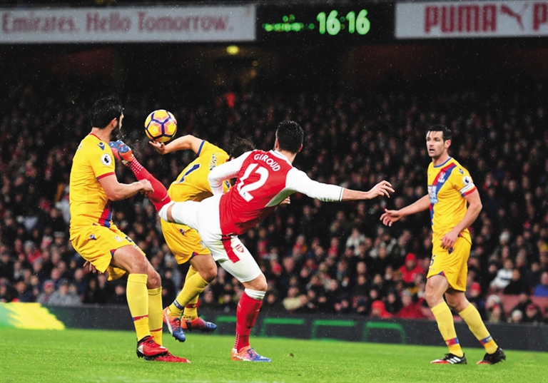 “枪手”阿森纳在酋长体育场迎战同城对手水晶宫,第17分钟,桑切斯禁区左侧传中,中路跟进的吉鲁脚后跟凌空射门,以一计“蝎子摆尾”式的动作将球打入对方大门,1:0。第56分钟,伊沃比在门前混战中头球建功,将比分变成2:0。