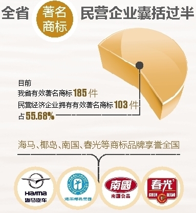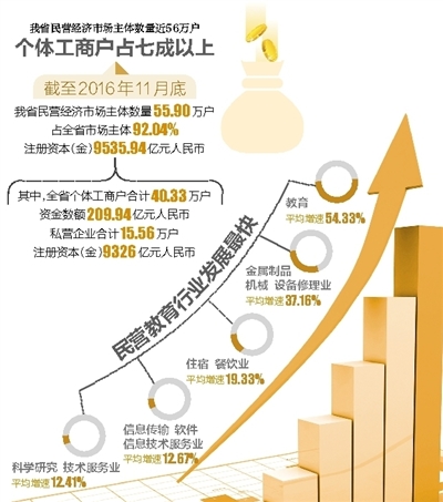 省工商局提供的数据显示,截至2016年11月底,我省民营经济市场主体数量为55.90万户,占全省市场主体92.04%;注册资本(金)9535.94亿元人民币,占全省投资总额46.17%。根据数据分析,我省民营经济非常重视科技创新和打造自主品牌,近年来非公有制经济主体已拥有65%的发明专利,75%的技术创新和80%以上的新开发产品。