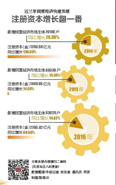 一系列有力的举措,有效促进了我省民营经济的持续稳步增长,取得了良好的经济效益和社会效益:2016年,全省市场主体总量比2013年增长77%,其中民营经济主体增长占到90%以上;民营经济主体总体年报率、存活率达到92.26%;民营经济在缓解社会就业、保障和改善民生方面发挥了突出作用。