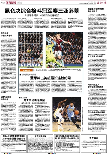 海南日报 体育新闻综合 012 2017-01-041 2017年01月04日 星期三