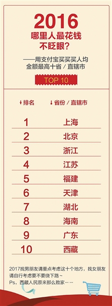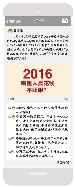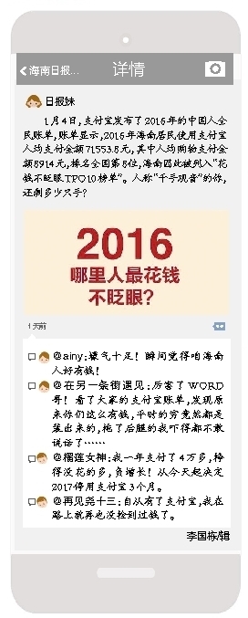 1月4日,支付宝发布了2016年的中国人全民账单,账单显示,2016年海南居民使用支付宝人均支付金额71553.8元,其中人均购物支付金额8914元,排名全国第8位,海南因此被列入“花钱不眨眼TPO10榜单”。人称“千手观音”的你,还剩多少只手?
