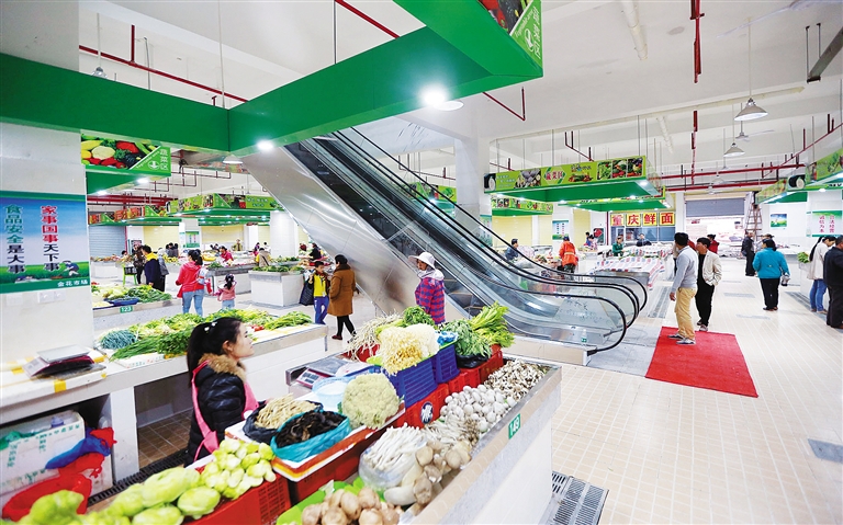 据了解,始建于1989年的琼山金花菜市场在2016年初按照海口“双创”工作的要求,迎来了自身的升级改造。在升级改造的过程中,该菜市场从原来的2000多平方米单层市场升级为现在13800多平方米的5层建筑,摊位将从原来的170多个增加至320多个。功能上从原本单一的菜市场升级为农贸、购物餐饮和儿童娱乐等一体化的综合服务场所。 本报记者 张杰 特约记者 林先锋 摄