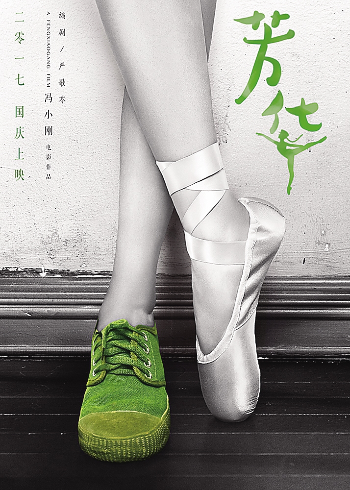 今天还首度曝光了《芳华》的电影海报,海报主画面为一双芭蕾舞演员的脚,两只脚却分别穿着军鞋和芭蕾舞鞋。两只鞋既代表文工团舞者身份,又表现出舞者所处大时代下的背景特征,表达出不同时代下对青春和美不一样的理解与诠释。灰色背景中,一抹淡绿渲染出冯小刚记忆中的那个“青春芳华”。