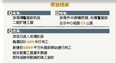 9个月,仅仅用了9个月的时间,机场二期扩建项目就完成了一系列繁琐的建设环节,进入了收尾阶段。目前,机场建设方正在协调竣工验收和行业验收事宜。2016年12月29日,博鳌机场已恢复通航。