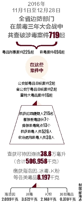 同时,我省边防部门也加强与海关、港务等各相关职能部门合作,构筑海上、岸线、陆地三道立体防线,并联合驻地公安部署开展了“百城会战”“雷霆扫毒”等专项行动,对辖区吸毒人员、涉毒场所、吸毒窝点、沿海易登船上岸的岸线、码头等重点人员、重点场所、重点区域进行重点排查梳理。