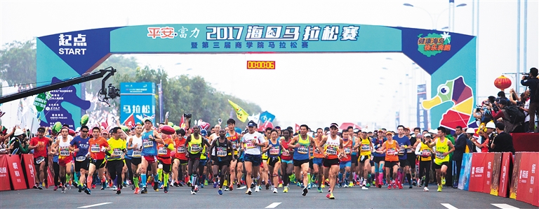 上午7时许,海口市国兴大道日月广场前路段人头攒动,万名参赛选手身着缤纷多彩的运动服,精神饱满整装待发,有77岁已经跑过99个“全马”的全程马拉松选手,有推着轮椅的残疾人选手,有一家三口齐上阵的迷你马拉松选手。