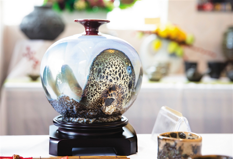 “火为木生,木为水生,陶是五行相生,艺是人的参与。”旅琼艺术家程连仲的作品《停车坐爱枫林晚》、《极目江山》面前挤满了观众,大家一边欣赏风格写意的陶艺作品,一边听程连仲讲解作品背后的寓意。