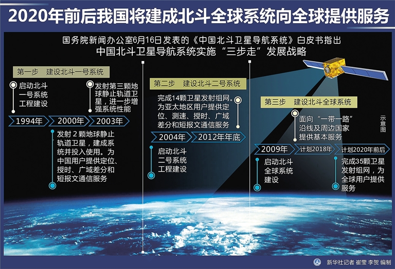 目前,北斗全球系统建设正在加速推进,已发射5颗试验卫星,根据后续组网建设计划,预计将于2018年率先覆盖“一带一路”国家,提供基础服务,2020年前后全面建成,具备覆盖全球的服务能力,全球系统在定位授时精度、抗干扰、系统容量等性能方面比北斗二号将有大幅提升。