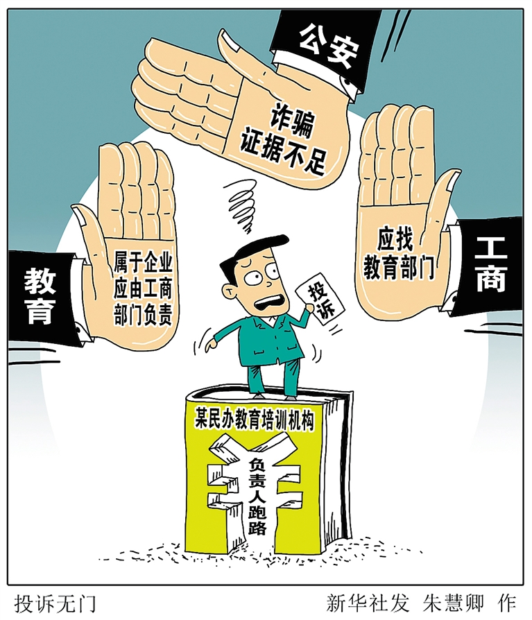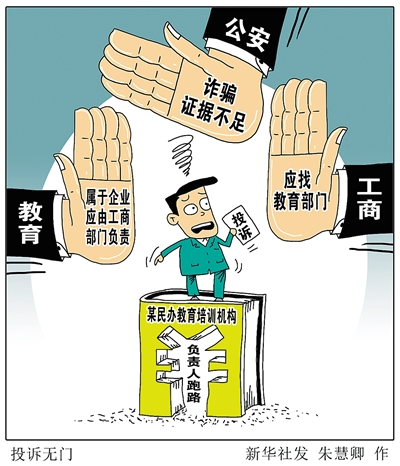 教育培训机构一旦跑路,受害者往往投诉无门。如2016年5月在湖南发生的“明思教育”跑路案,73名家长的143万元被卷走。家长们找工商部门,得到的答复是这家机构是教育行业,应找教育部门;教育部门说,机构没有办理“办学许可证”,而是在工商部门办的营业执照,属于企业超范围经营,应由工商部门负责;公安部门则表示,诈骗证据不足无法立案,让家长们直接到法院起诉。