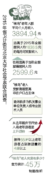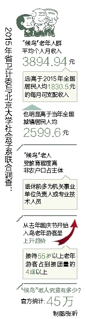 2015年,海南省卫计委与北京大学社会学系联合对非海南省户籍的季节性来琼人口进行调查,选取三亚等5个城市作为调查区域,样本总量1200人,并发现“候鸟”老人的一系列特征。联合调查显示,“候鸟”老年人群的平均个人月收入为3894.94元,远高于2015年全国居民人均1830.5元的每月可支配收入,也明显高于当年全国城镇居民人均2599.6元的水平。同时,“候鸟”老人受教育程度高,非农户口占主体,退休前多为机关事业单位负责人或专业技术人员。